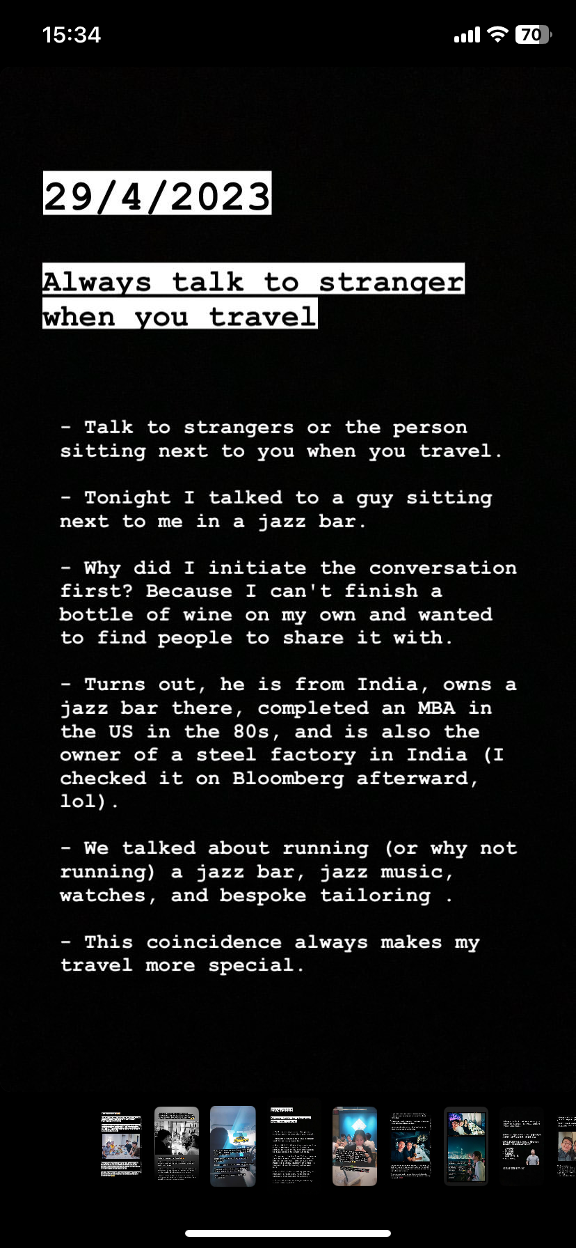 I cherished the experience of opening up to strangers, knowing our paths might never cross again, both of us will be more engaged with the conversation and the experience you had together.