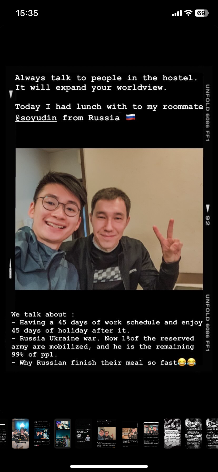- In a Tokyo hostel, I met a Russian guy who happened to be my roommate. He works in the transportation industry and follows a unique schedule: 45 days of work followed by a 45-day holiday. This lifestyle allows him to dedicate a significant amount of time to travel during his breaks, a lifestyle I hadn't encountered before.