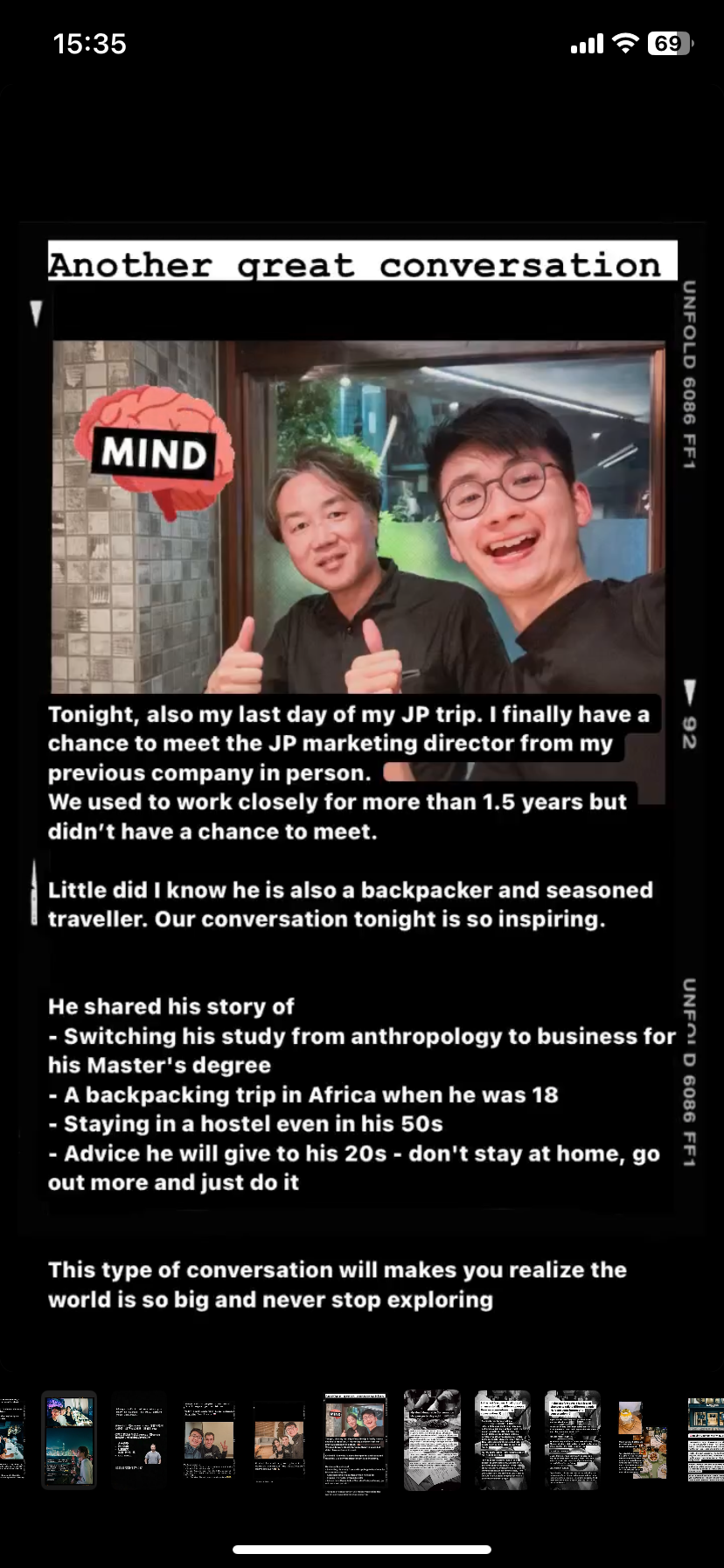 - Meeting a colleague from my previous company in Tokyo for the first time i. Despite being in his 50s, he occasionally stays in hostels during his travels. His advice to those in their 20s was simple: don't stay at home, go out more, and just do it.